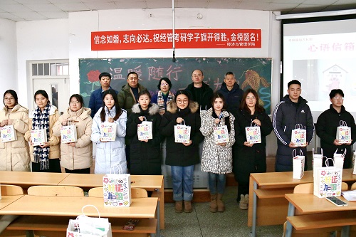 王蓉院长代表学院对考研学子寄予殷切厚望,送上祝福和嘱托,为他们加油打气。她鼓励同学们自信迎考、沉着应考、顺利赢考,并在考研复习方式和考试答题技巧上进行了指导。随后,学院领导带着满满的祝福和期盼为考研学子送上“暖心大礼包”,让同学们一定要坚定信念、披荆斩棘、决战最后时刻。