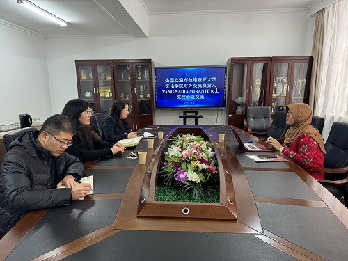 1月2日上午,印度尼西亚布拉维查亚大学文化学院对外交流负责人YANG NADIA MIRANT女士到beat365国际教育学院交流访问。国际教育学院直属党支部书记、院长王春雨,副院长王亮,副院长杨博,行政干事杨若冰参加会见。会议由王春雨主持。