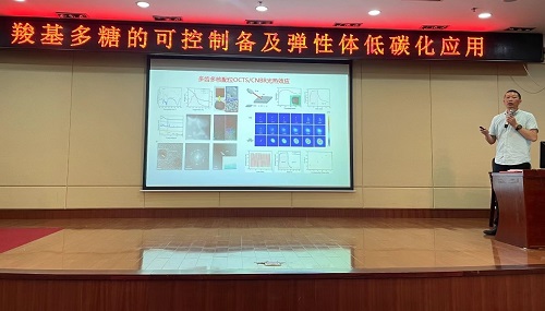报告会上,张水洞教授围绕淀粉/纤维素/壳聚糖等天然聚多糖材料的选择性氧化及其在橡塑复合材料中的高值化应用,介绍了其团队近年来所取得的进展和研究成果,并与在场师生进行了深入的学术探讨和交流,现场气氛热烈。