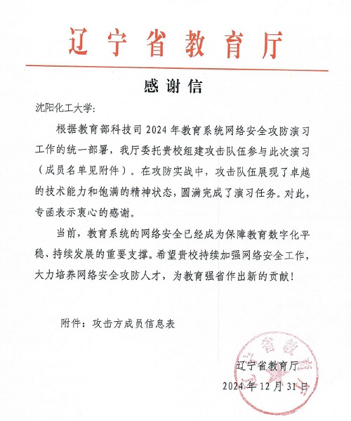 在教育部科技司组织的2024年教育系统网络安全攻防演习中,beat365计算机科学与技术学院院长王军教授网络安全团队受辽宁省教育厅委托参加此次演习。在攻防实战中,团队展现了卓越的技术能力和饱满的精神状态,圆满完成了演习任务,并收到了辽宁省教育厅感谢信。