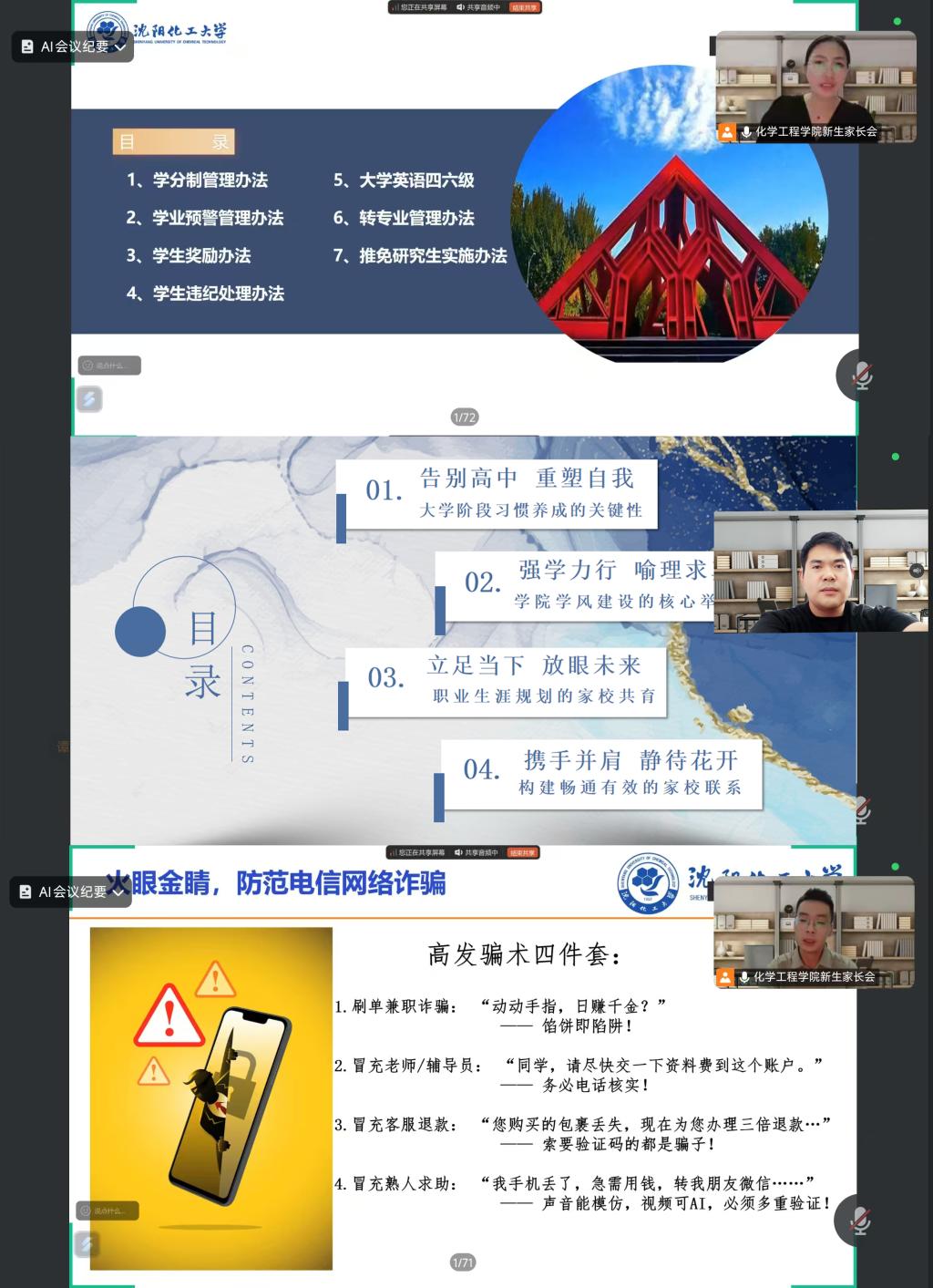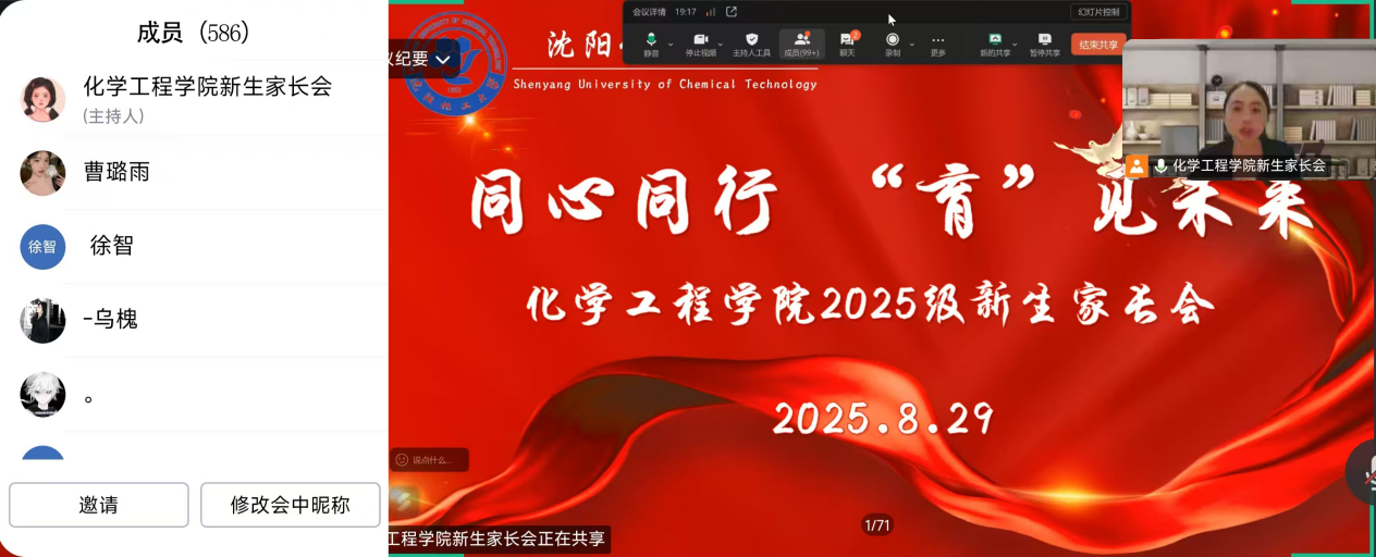为帮助2025级新生提前适应大学生活、顺利完成角色转变,同时让家长全面掌握学院学生教育管理体系与入学报到流程,8月29日,化学工程学院以“同心同行‘育’见未来”为主题,线上召开新生家长会暨新生入学“前置”教育活动,成功搭建起家校协同育人的“云端桥梁”。化学工程学院党委副书记孙晓静,2025级新生辅导员时振芳、李明旭、马俊佼,以及全体2025级新生及家长共同参与此次活动。