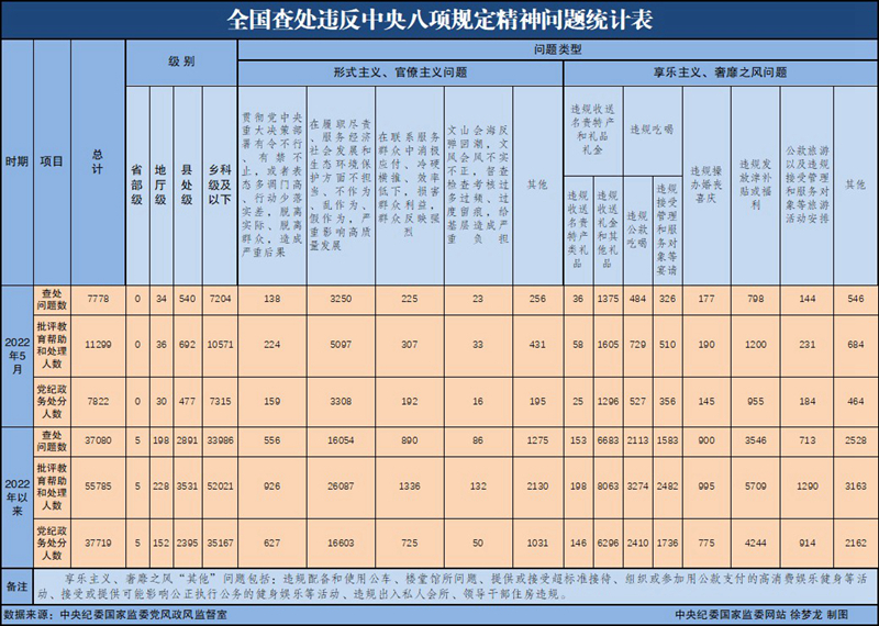 6月27日,中央纪委国家监委公布了2022年5月全国查处违反中央八项规定精神问题汇总情况。当月,全国共查处违反中央八项规定精神问题7778起,批评教育帮助和处理11299人,其中,党纪政务处分7822人,这是连续第105个月公布月报数据。