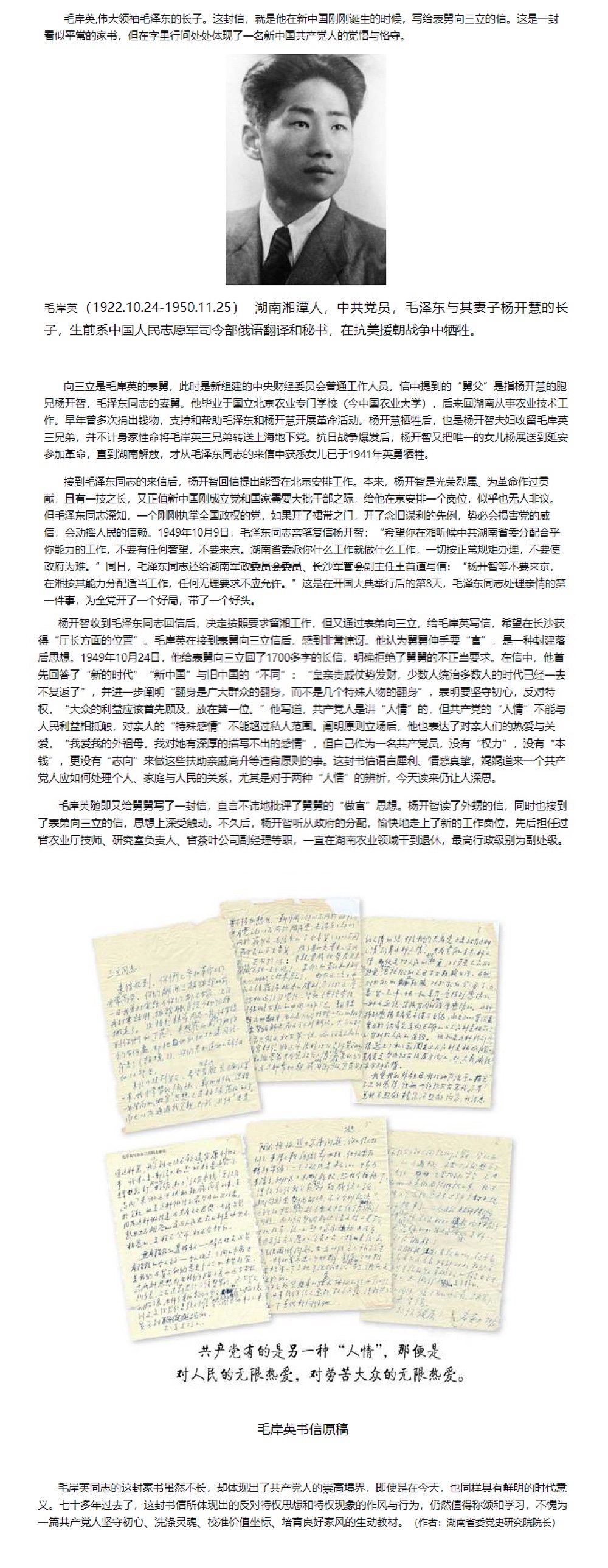 【学习党史•重温经典】一封反对特权思想的家书——读毛岸英致表舅向三立的信有感