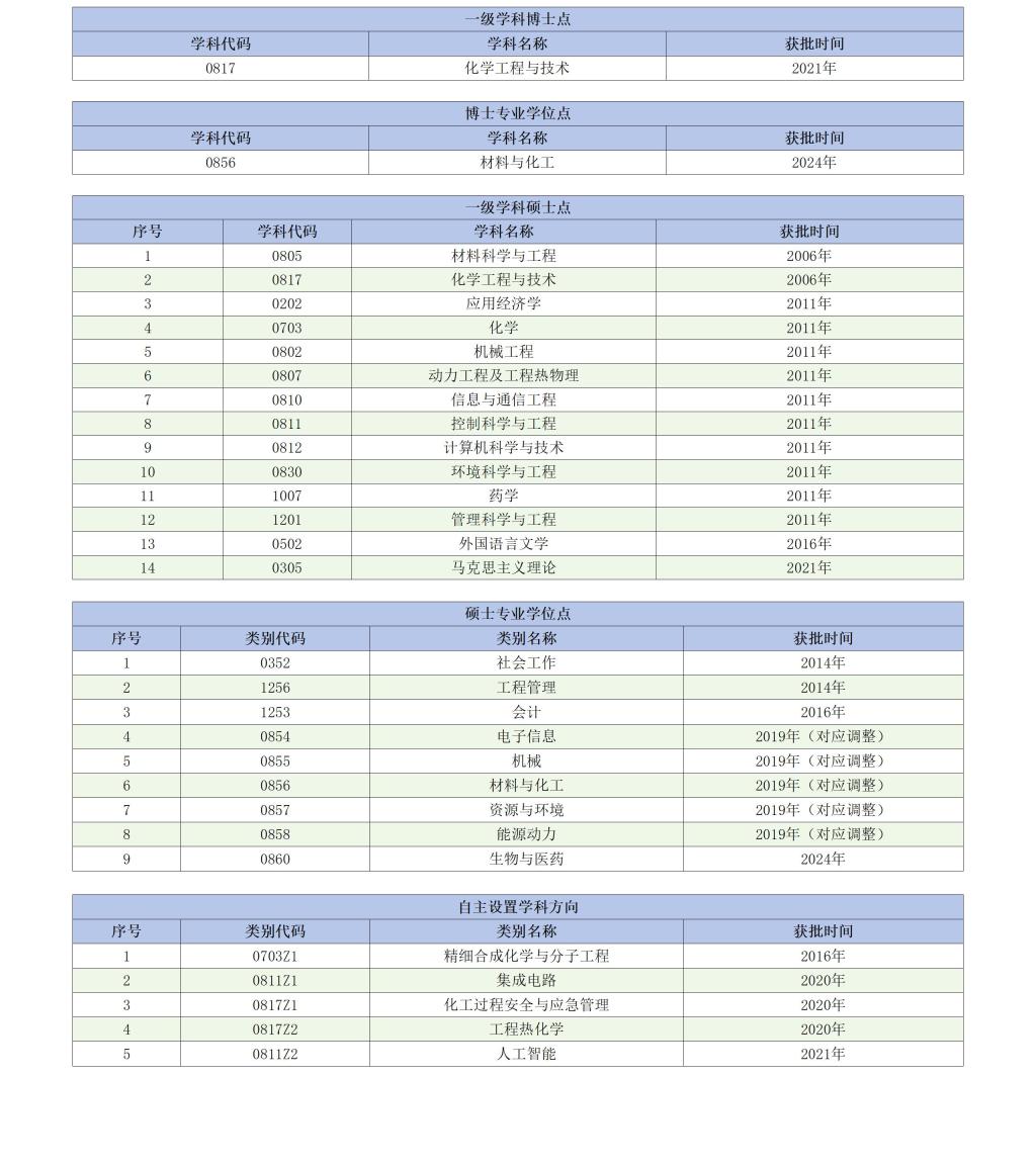 经过建设,学校已具备培养学士、硕士和博士学位授权的完整教育体系,拥有1个一级学科博士学位授权点、1个博士专业学位授权点、14个一级学科硕士学位授权点和9个硕士专业学位授权点,设有化学工程与技术博士后科研流动站,构建了以化工为特色,工、理、管、经、文、法、医等多学科协调发展的学科体系。