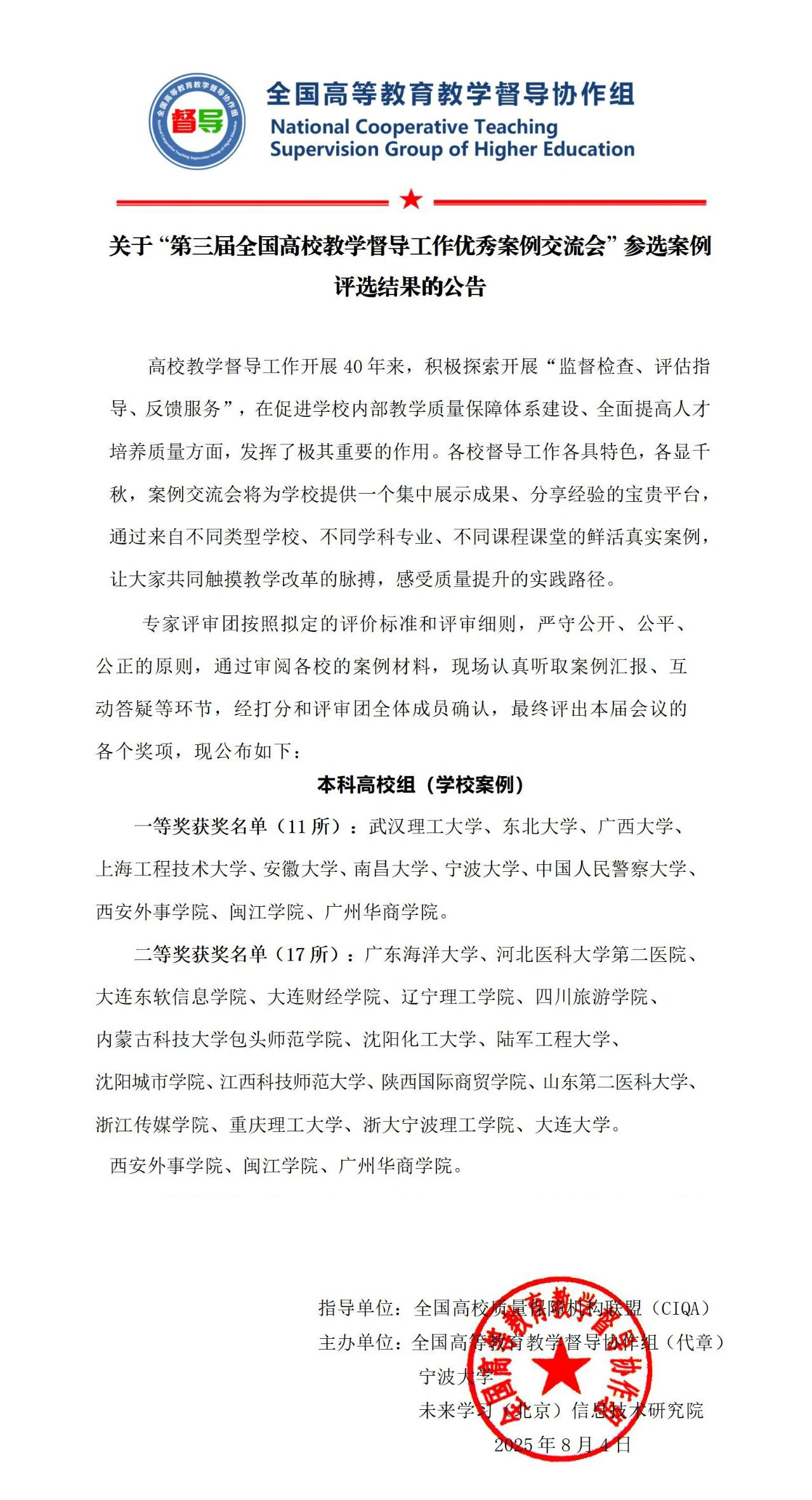 本次交流会于2025年7月25日至28日在大连举行,由全国高校质量保障机构联盟(CIQA)和全国高等教育教学督导协作组联合主办,旨在促进高校教学督导工作的经验交流与创新发展。共有100所高校参与本次案例评选,最终评选出一等奖11名、二等奖17名。beat365案例能够获得此项成绩,体现了学校在教育教学质量保障体系建设方面取得了一定成效。